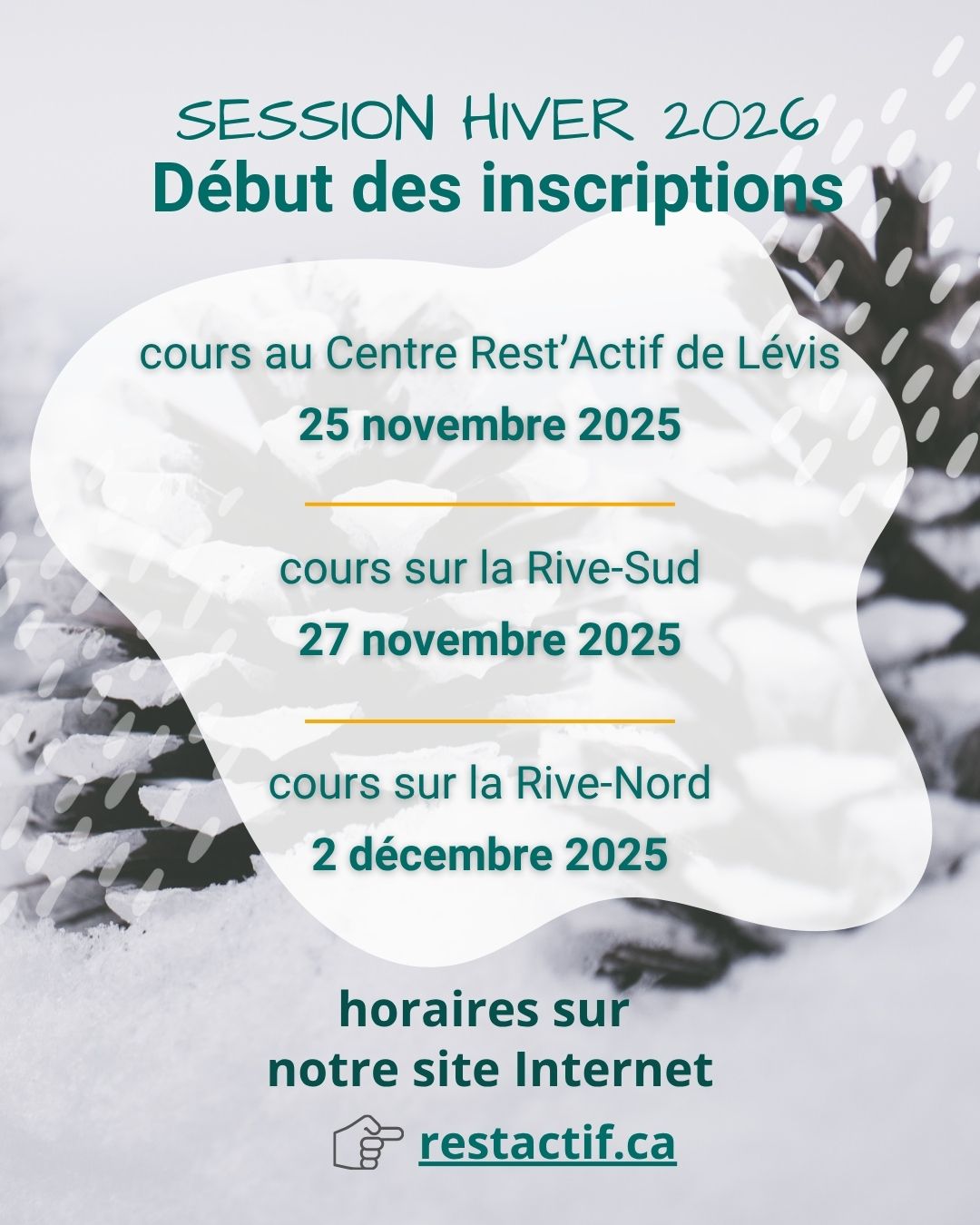 Session Hiver 2025 Les inscriptions pour la session d’hiver 2026 débuteront le 25 novembre pour les cours au Centre Rest'Actif de Lévis, le 27 novembre pour les cours sur la Rive-Sud et le 2 décembre pour les [...]
