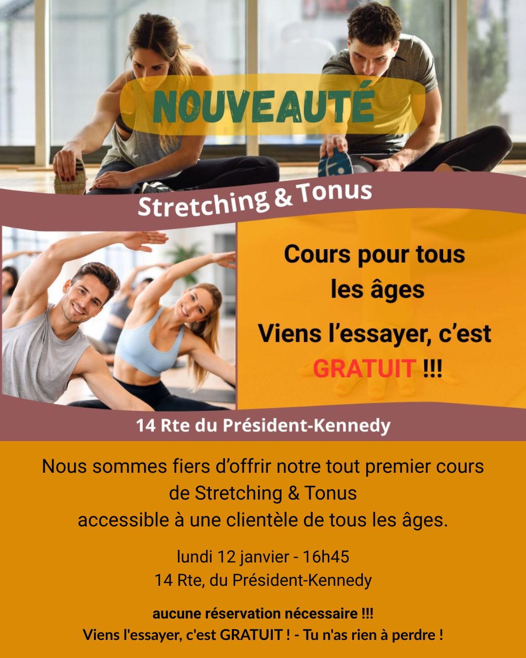 Stretching et Tonus s'inscrire au cours Début des cours à Lévis, lundi 12 janvier 2026 de 16h45 à 17h45 S’étirer tout en gagnant du tonus musculaire, quelle bonne [...]